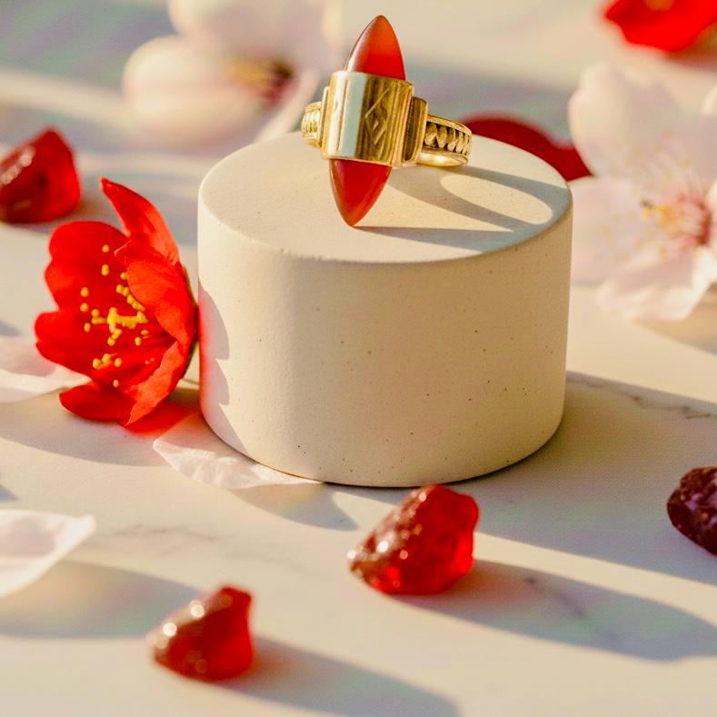Voici une bague audacieuse qui attire l’attention avec son design affirmé. Notre création met en valeur une magnifique pierre d’agate ou de cornaline rouge intense, taillée en pointe pour un effet sculptural saisissant. La monture en métal doré (laiton ou plaqué or) présente des gravures délicates et un travail de métal détaillé sur les côtés de l’anneau, rappelant des influences ethniques ou architecturales.
