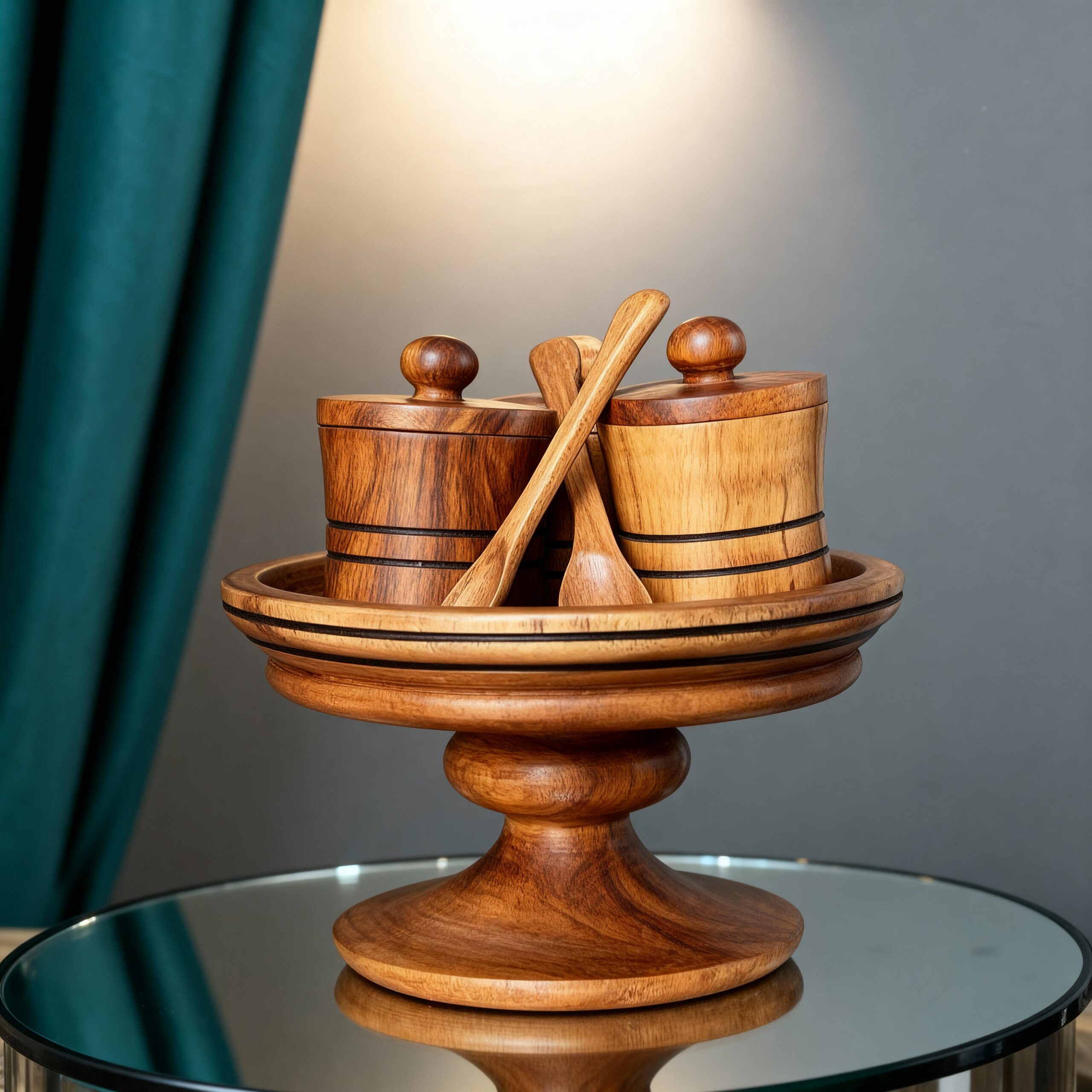 Cet ensemble à condiments apporte une touche d’authenticité et d’élégance naturelle à votre table. Entièrement réalisé en bois aux nuances chaudes, le service se compose de deux pots cylindriques avec couvercles, perchés sur un présentoir à pied assorti.