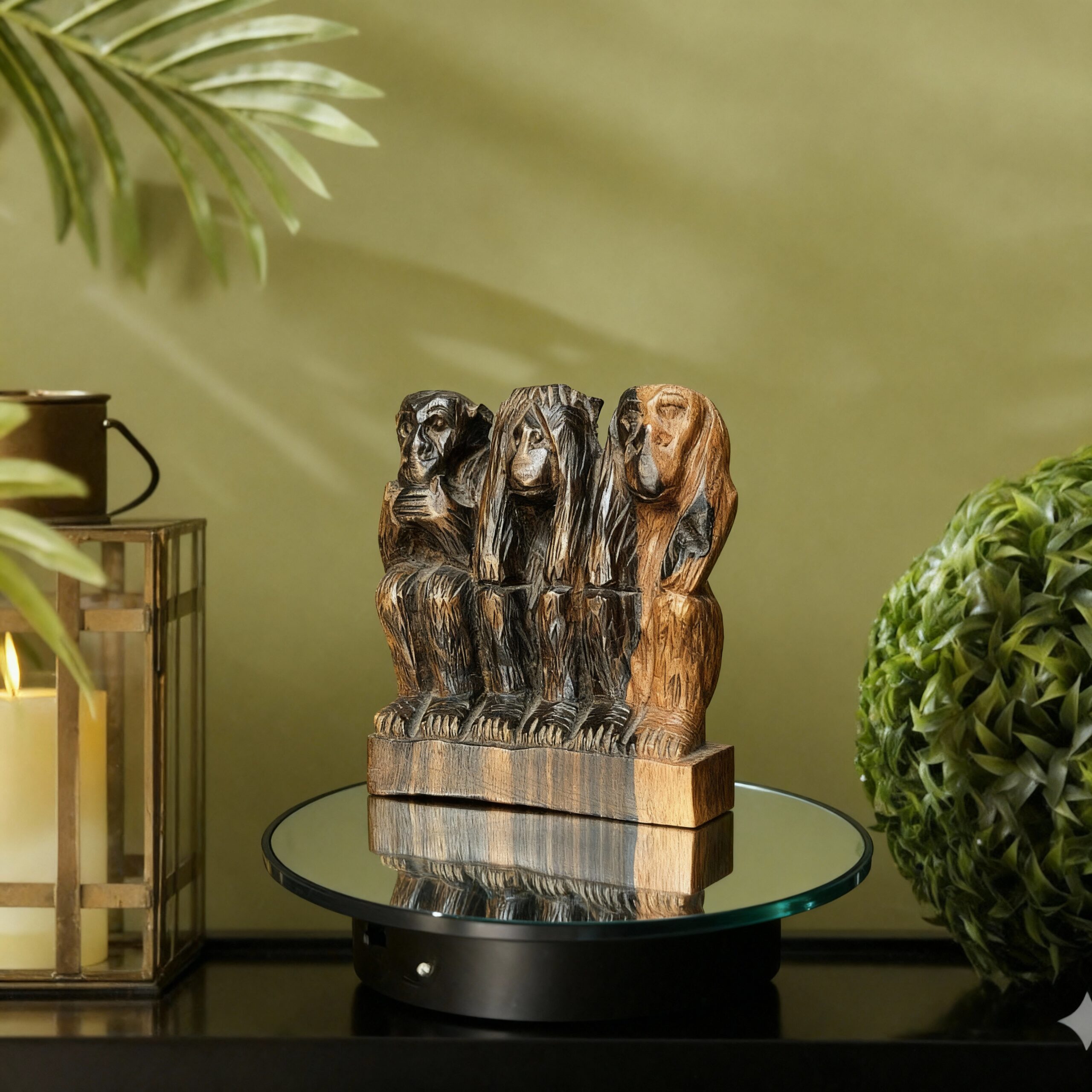 Voici une magnifique statue en bois représentant les célèbres trois singes de la sagesse (Mizaru, Kikazaru et Iwazaru) : « Ne rien voir, ne rien entendre, ne rien dire de mal ». Sculptée à la main dans un bois naturel aux nuances chaudes, cette pièce dégage une authenticité et un charme ethnique indéniables.